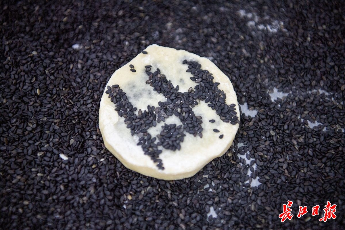 粘上芝麻的饼坯上是一个“玉”字。