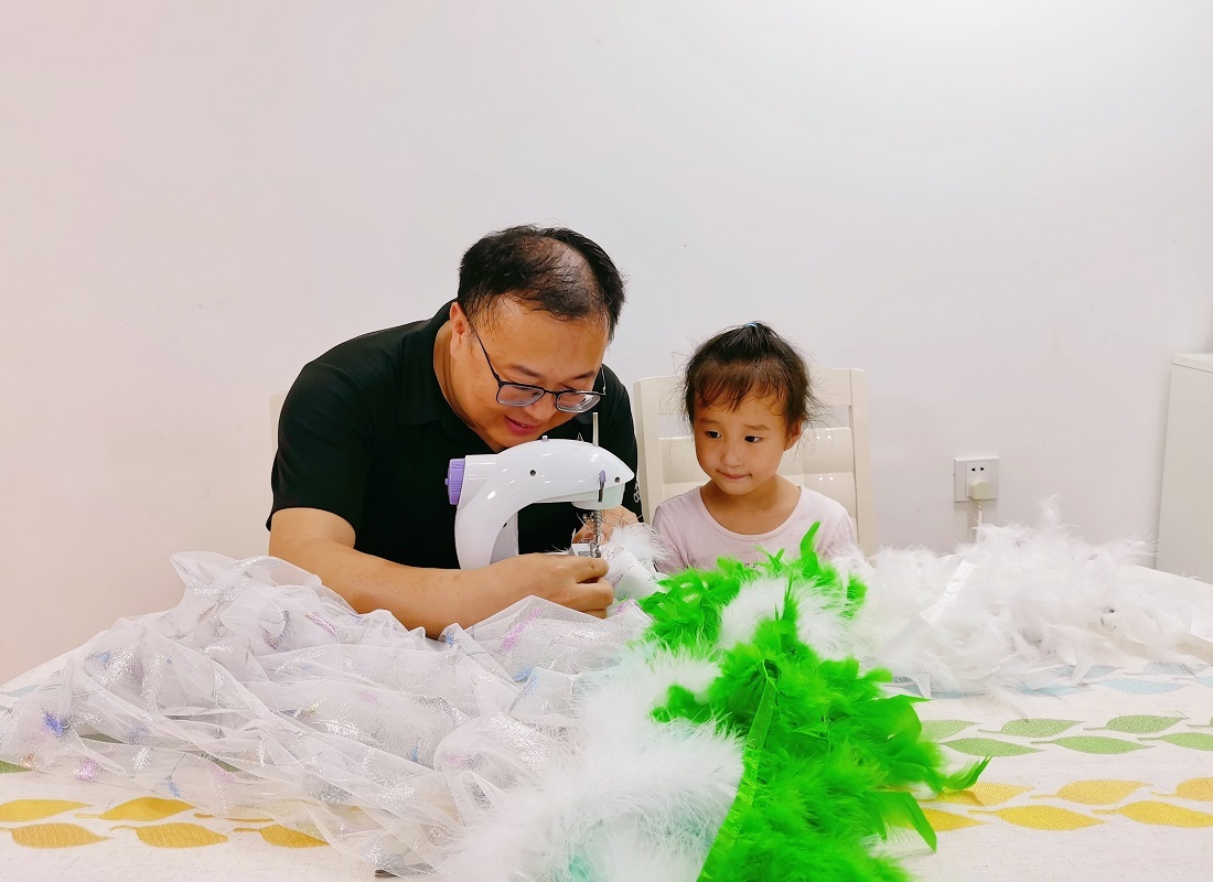 “神仙老爸”为孩子缝制七彩羽衣。通讯员段娆 摄