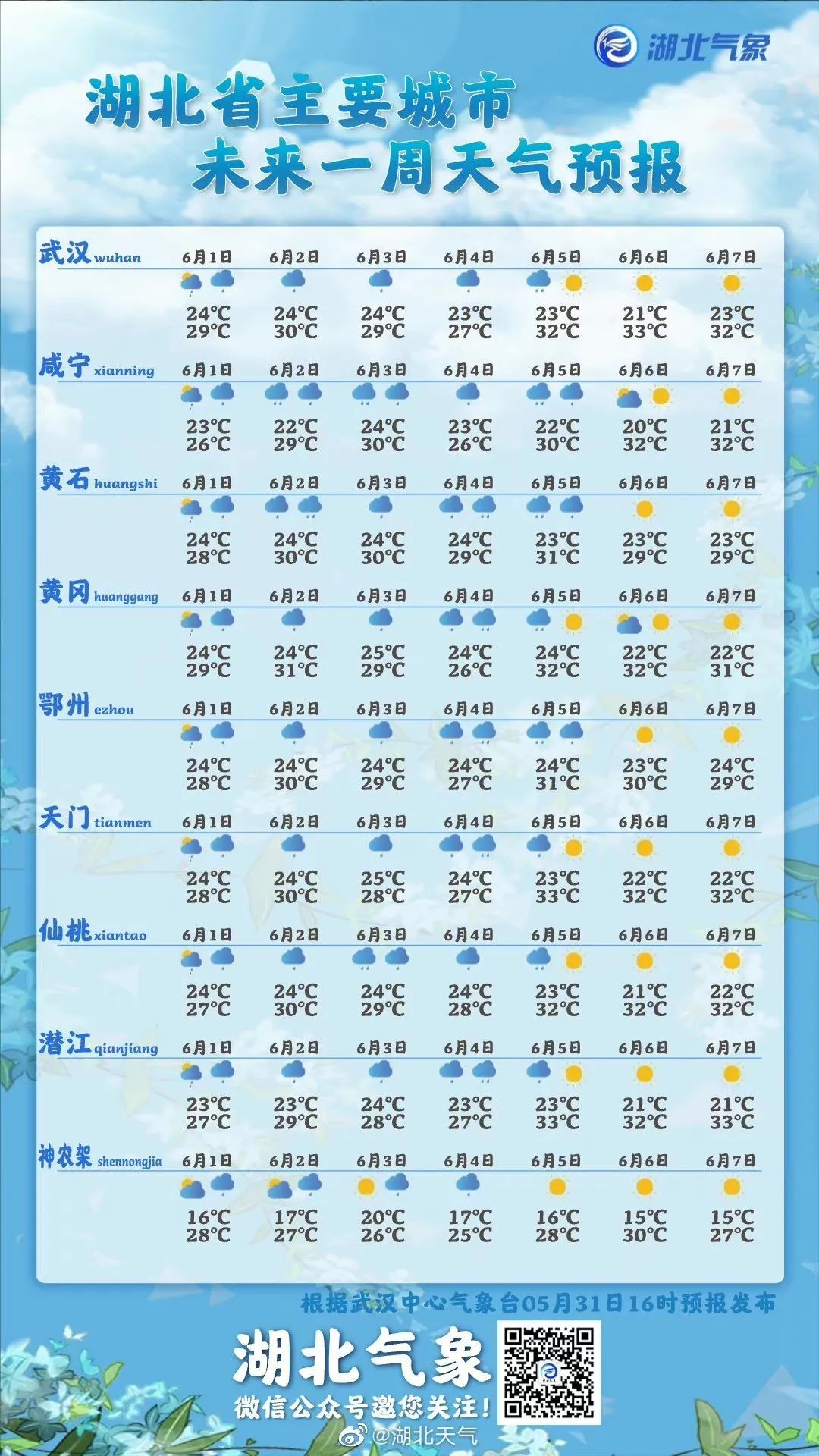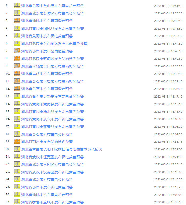 截至今天21时30分,湖北已发布53条预警,涉及武汉、黄冈、仙桃、鄂州、孝感等地,多为雷电黄色、暴雨橙色预警。