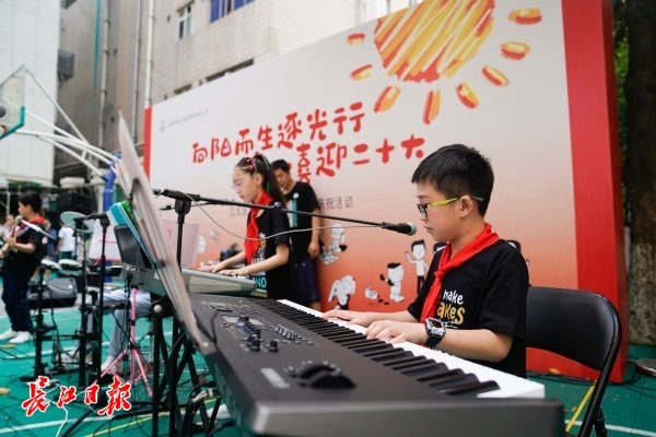 《你笑起来真好看》《起风了》《New boy》《孤勇者》……“六一”活动上,“萌伢”乐队一口气演奏了近20分钟,现场就像一场小型音乐会,同学们都“嗨”起来了。有学生激动地说:“这乐队太帅气了,他们就是我们校园的明星!”