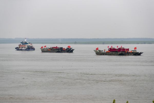演练人员利用漕渡门桥运送大型装备渡江。 通讯员粟毅 摄