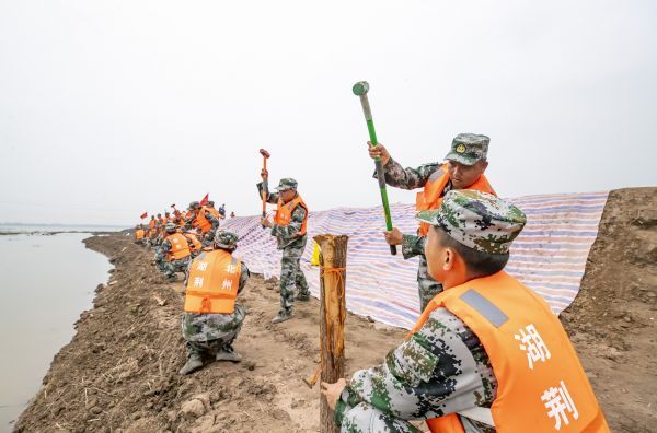 参演民兵在加固堤坝。 通讯员粟毅 摄
