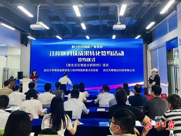 当日,“数字经济赋能产业发展”江岸区科技成果转化签约活动在武汉创立方产业园举行。现场,武汉大学测绘遥感信息工程学院国家重点实验室与武汉天眼智达科技有限公司、中国地质大学工程学院与湖北武麻高速公路有限公司(以下简称“武麻高速”)等一批校企合作项目签约。