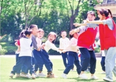 浙江湖州长兴县太湖街道晨光社区儿童之家外,社区志愿者在课后托管时带领孩子们户外游戏。