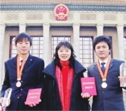 钟波(左一)和老师同学到北京领奖时在人民大会堂外留影。本人供图