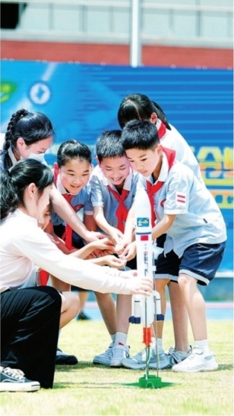 在老师们的指导下,孩子们穿上小小“航天服”,坐上“航天座椅”,体验航天员眩晕训练;团队携手,现场组装发射“小火箭”,放飞自己的航天科技梦。