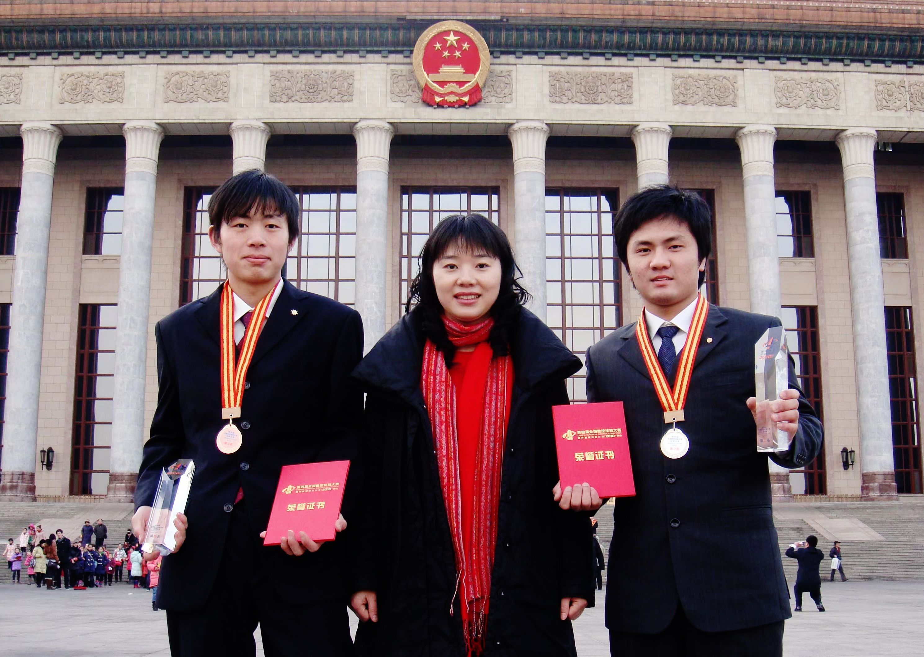 钟波(左一)和老师同学到北京领奖在人民大会堂外留影。