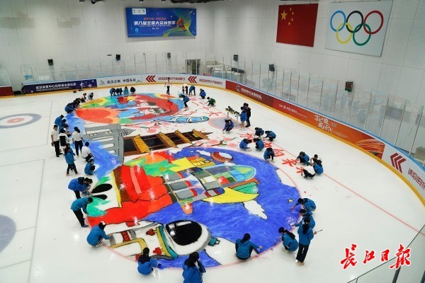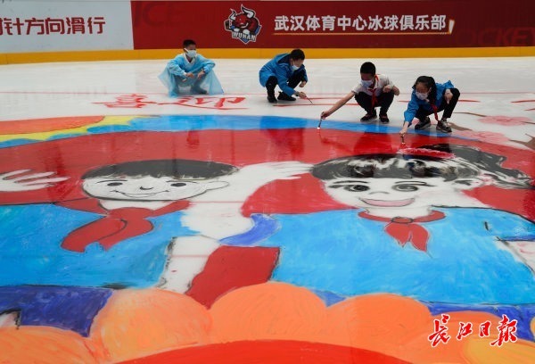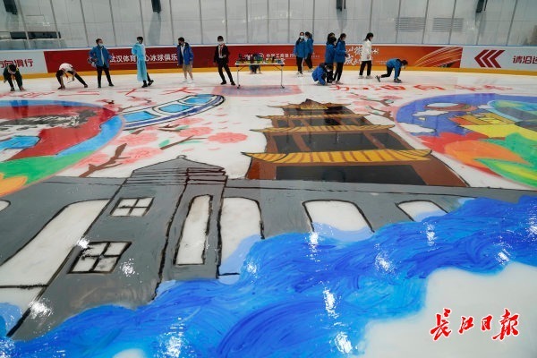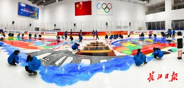 48名六年级学生手拿画笔,用特殊颜料在冰面上为绘画填色。长江日报记者看到,绘画的主体部分是大大的沙漏,黄鹤楼、长江大桥、樱花、和谐号等代表着家乡的事物通过孩子们的画笔流淌到冰面上,将文化记录,将历史传承。整幅作品有25米长,15米宽,占满了冰球场一侧的进攻区。