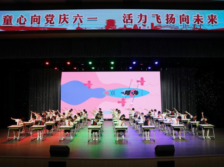 整场联欢会精彩纷呈, 老师们和同学们集思广益,经过一次次的曲目筛选、动作设计、个性编排、服道挑选、整体优化,向观众展现出了一场精彩的文艺演出。庆祝活动由三个部分内容构成,首先是一年级新发展的少先队员入队仪式,仪式上,新队员们激动且自豪;接着表彰了一批“优秀少先队员”“优秀学生干部”“学习积极分子”;最后是文艺演出,孩子们身着节日的盛装,表演节目主要以各个班级为单位的桌面操为主, 每个班级都做到了动作整齐、姿态优美,呈现出了充满童趣、生动活泼、精彩纷呈的表演。充分展示了孩子们的活泼个性,也是给每一个孩子一个平等的机会,去参与,去感受,使“六一”庆祝活动真正成为孩子们去展示自己梦想的舞台。