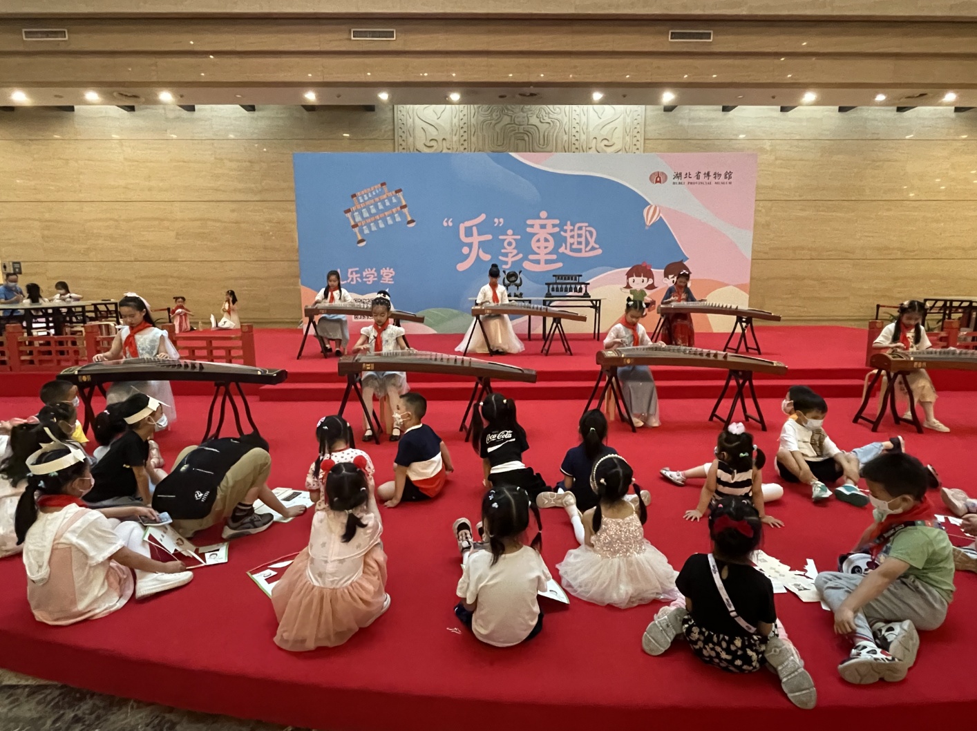 孩子们在湖北省博物馆演奏乐器。