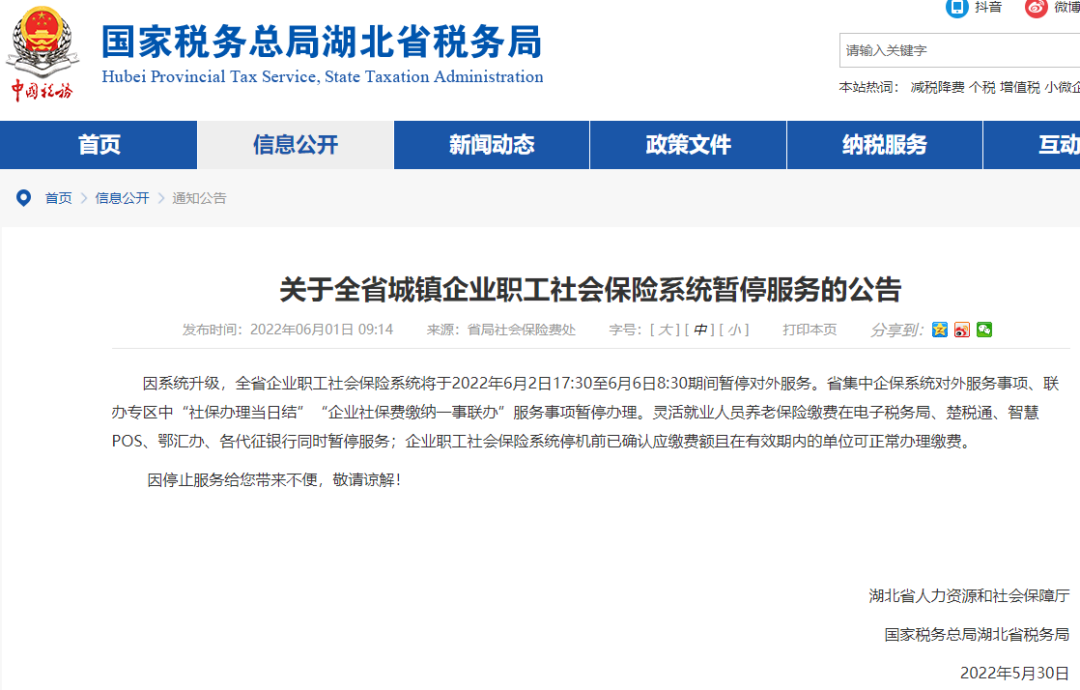 6月1日,国家税务总局湖北省税务局官网发布《关于全省城镇企业职工社会保险系统暂停服务的公告》,因系统升级,全省企业职工社会保险系统将于2022年6月2日17:30至6月6日8:30期间暂停对外服务。