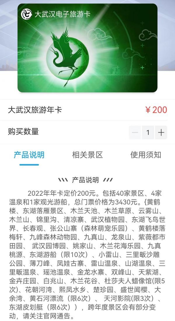 2013年,持此卡可不限次数免费进入黄鹤楼、东湖磨山、木兰草原、木兰山、木兰天池、锦里沟、清凉寨、东湖海洋世界等21家景区,门票面值合计达到1084元。2022年,大武汉旅游年卡包含40家景区、4家温泉和1家观光游船,总门票价格为3430元。