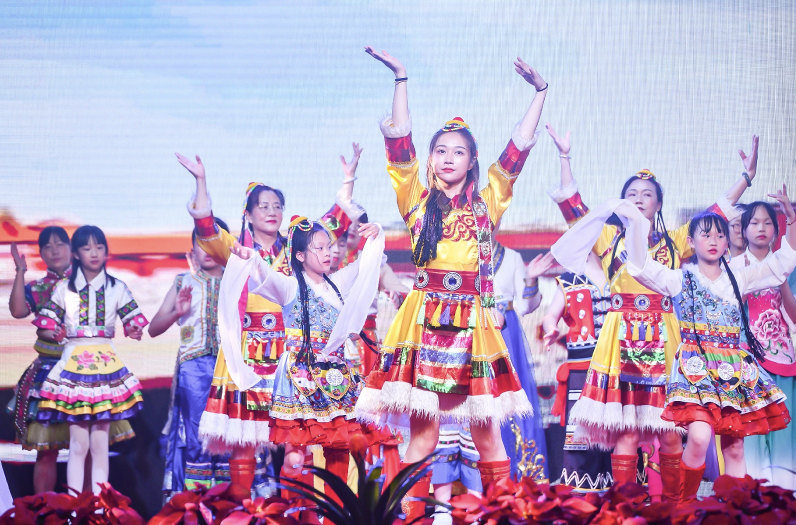 晚会在欢快的舞蹈《再唱山歌给党听》中落下帷幕,师生身穿56个民族的特色服饰,载歌载舞,寓意民族团结。