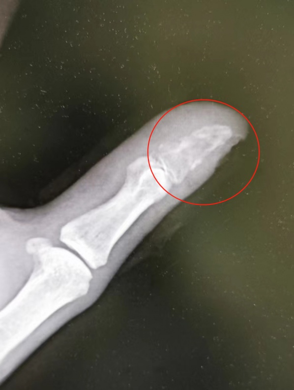 患者拇指末节指骨被细菌侵蚀“吃空”。