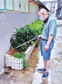记者在5楼平台上看到,志愿者正拿着自制的铁夹子,仔细清理平台下水管周围的杂物,一些树叶、纸片从下水道里掏出来,清理到附近的垃圾桶中。平台中央的小花园内,还有志愿者正在修剪花花草草。