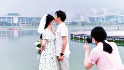 当天上午的月湖风景区内,走几步就会在林间、草坪、湖畔旁看见刚领完证,正在户外拍照的新人。余磊和杨慧婷就是特地请了一天假来月湖领证的,杨慧婷还专门带上闺蜜来当“跟拍摄影师”。在室内证婚点留影后,二人又冒着小雨来到月湖湖畔继续拍照。