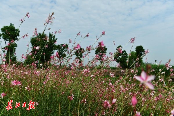 2日,金银湖绿道白马泾桥附近的湖岸边,大片山桃草粉色的花朵将湖畔绿道装扮成如画的美景。 记者李永刚 摄