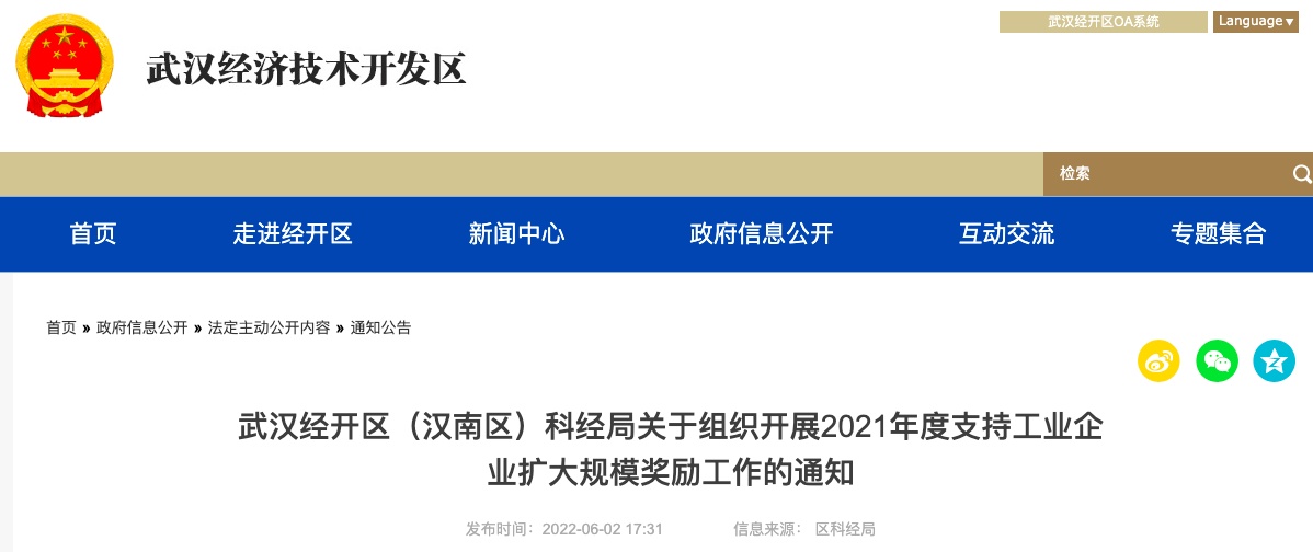 武汉经开区(汉南区)科经局关于组织开展2021年度支持工业企业扩大规模奖励工作的通知