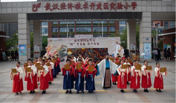 武汉经开区第四学区纱帽山小学、邓南中心小学的孩子们也在云直播中共同观赏端午课程现场活动,并在学区师生书法作品展中展示了他们的作品。