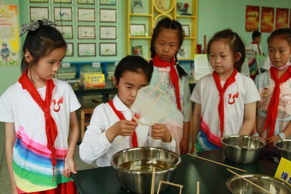 在跨学科学习体验区里,四(9)班雷宇轩同学拿着剥开的菖蒲向大家介绍造纸项目的探究过程和工艺流程,他感叹地说:“做一张纸可真不容易啊,平时我们要节约用纸。”三(9)班李雨桐在完成了提取精油的学习后说:“我们在这样的实践过程中能清晰地看到提取精油过程,了解科学原理,学到很多知识,科学太有趣了!”活动结束后,四年级的孩子们将包好的爱心粽子送到养老院,送上节日问候。
