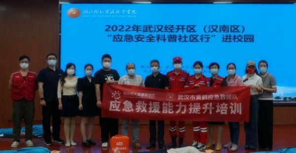 2022年6月2日上午,在武汉经开区应急管理局的大力支持下,武汉经开区东荆街道邀请武汉市黄鹤救援队到滩头山社区筹备组,走进辖区的湖北国土资源职业学院开展应急科普行活动,现场教职工群众和学生50人按照疫情防控要求参加了学习。武汉市黄鹤应急救援队讲师陈曦围绕生活中突如其来的“杀手”——气道异物梗阻,详细讲解了生命的拥抱——海姆立克急救法的原理、识别两步法、针对不同人群开展急救的要点以及自救的技巧等,并着重讲解了心肺复苏——胸外按压及人工呼吸的注意事项及操作要点。黄鹤应急救援队队员现场演示海姆立克急救法及心肺复苏急救法,以有奖答题以及邀请学院师生、社区居民参与体验式学习,一对一指导、讲述、探讨急救技巧。