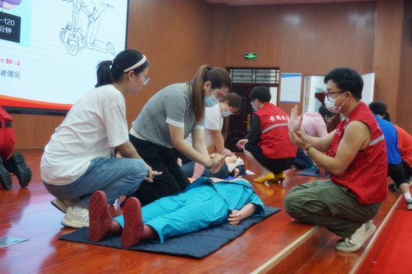 本次培训采用线上线下同步进行,面向全校师生及广大居民全程直播。现场还进行了创伤自救互救、心肺复苏、海姆立克急救法及AED操作使用的应急科普知识培训。学院师生、居民群众热情高涨,积极参与互动答疑,踊跃上台进行实际操作,现场演示到中午12时多大家依然兴致勃勃。