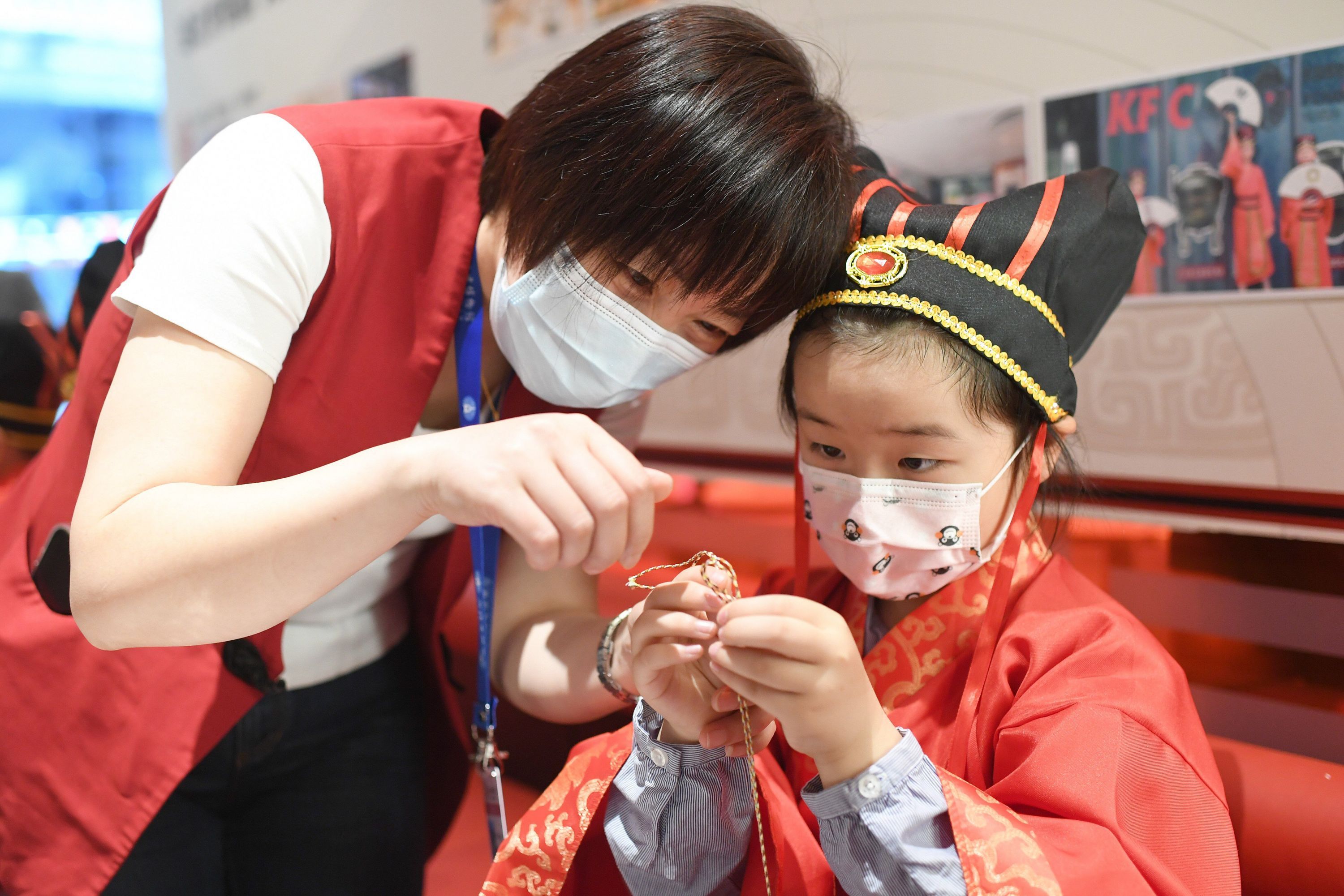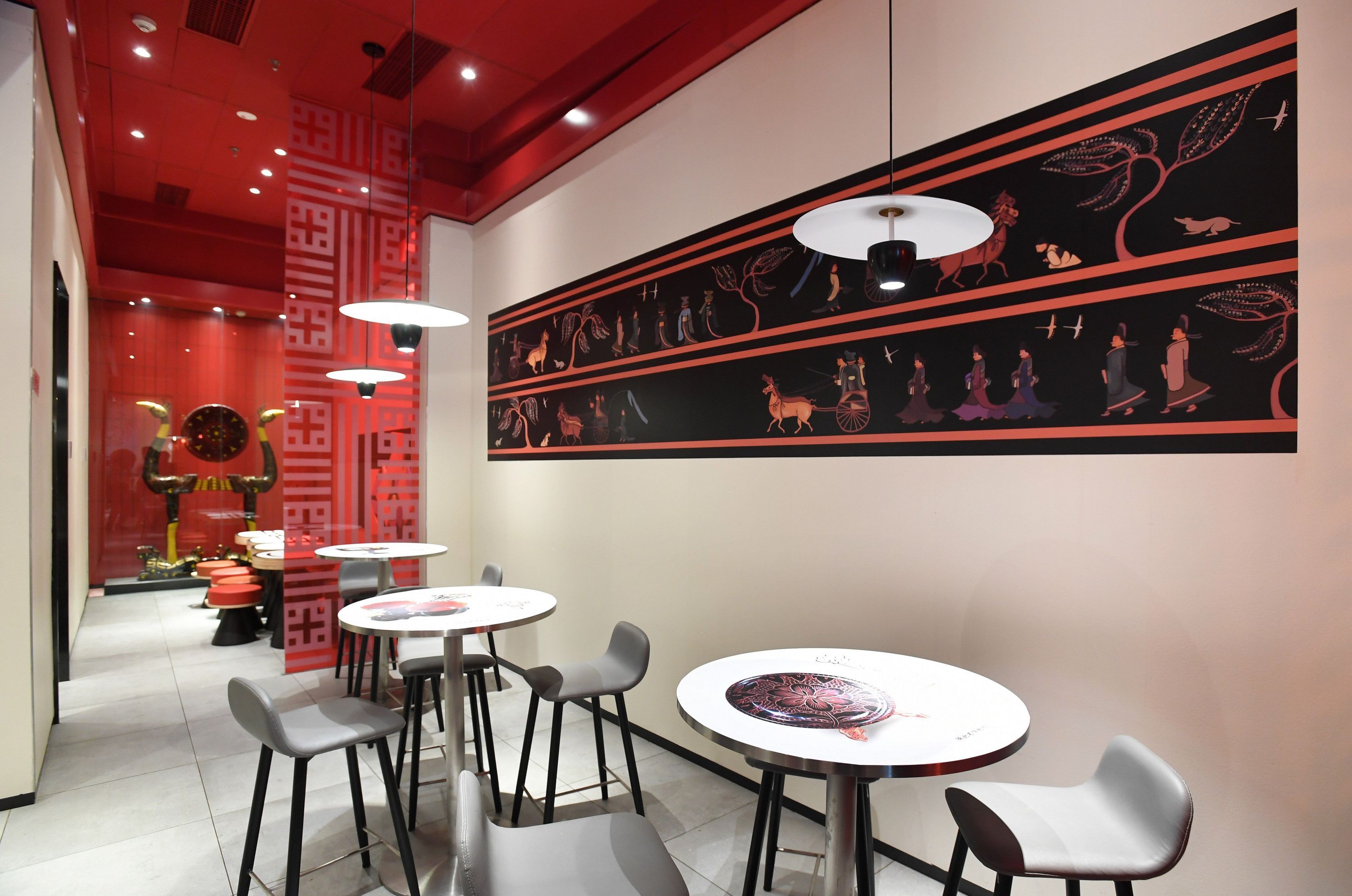 在餐厅内浓浓的“楚文化”氛围里,“车马出行图”“彩绘凤鸟双联漆杯”“彩绘龙蛇座漆豆” 等具有楚文化特色的文物让小朋友们仿佛置身博物馆,店内的“虎座鸟架鼓”模型,让小朋友们直观的体验到“楚文化”的浪漫色彩。餐厅一进门的红色屏风也很吸引人,原来上面的纹饰创意来源于战国时期的“席”,而最具肯德基特色的全家桶上也装点着编钟及楚文物中的龙形。