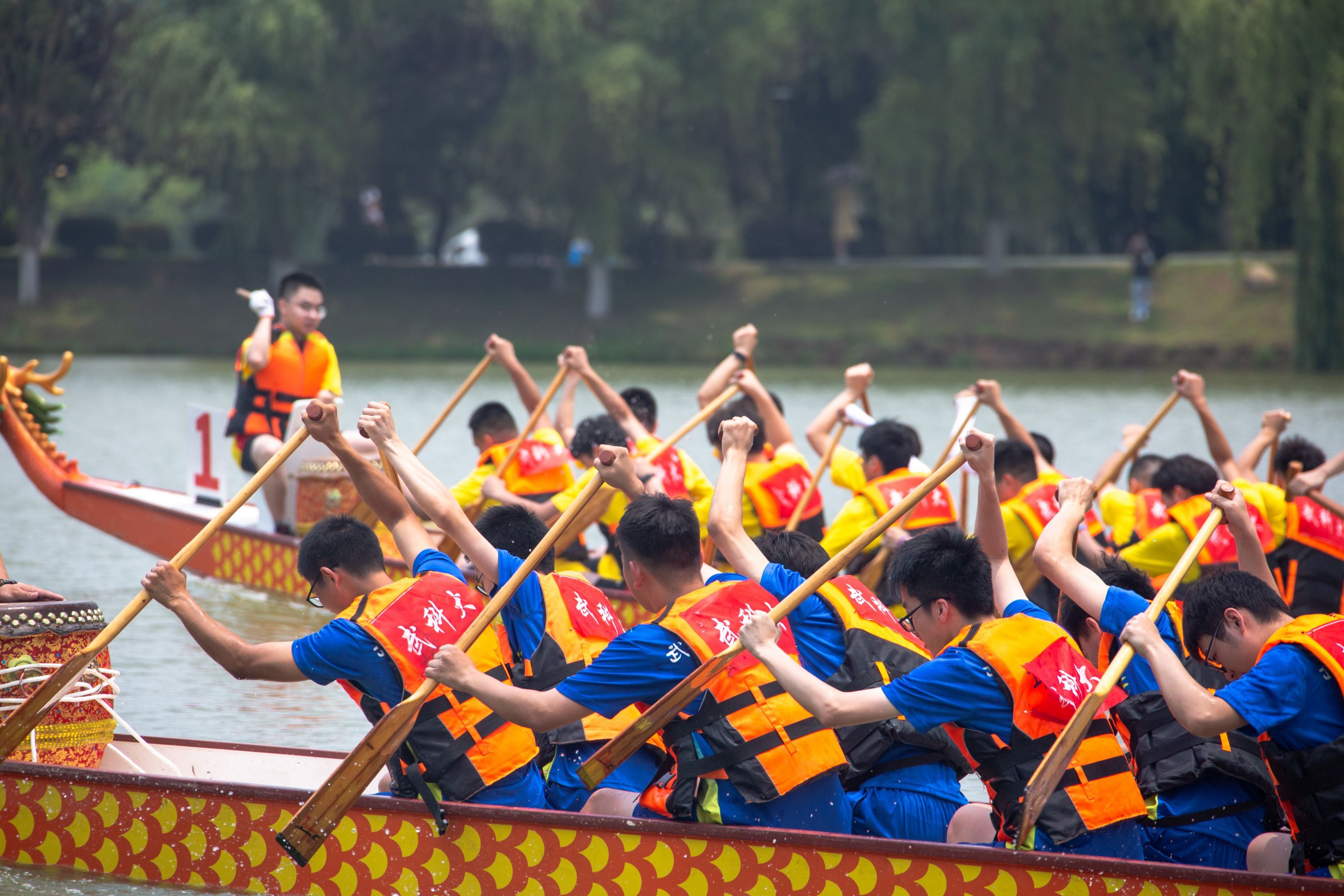 比赛当天,伴随着阵阵擂鼓声和欢呼声,学生们奋力摇桨,龙舟似离弦之箭,快速划过沁湖。赛龙舟是武汉科技大学每年端午的保留节目,由本科生代表队、研究生代表队、体育学院代表队和学校运动会冠军队四支队伍争夺最后的胜利。在热烈的气氛中你追我赶,互不相让。