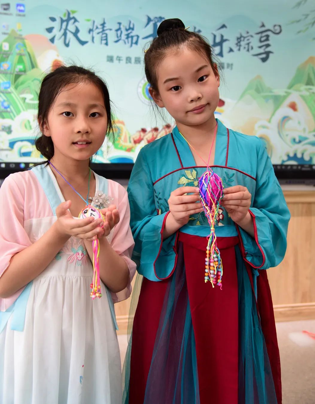 万松园路小学学生身着民族服饰包粽子、制作香包。 通讯员王莎 摄