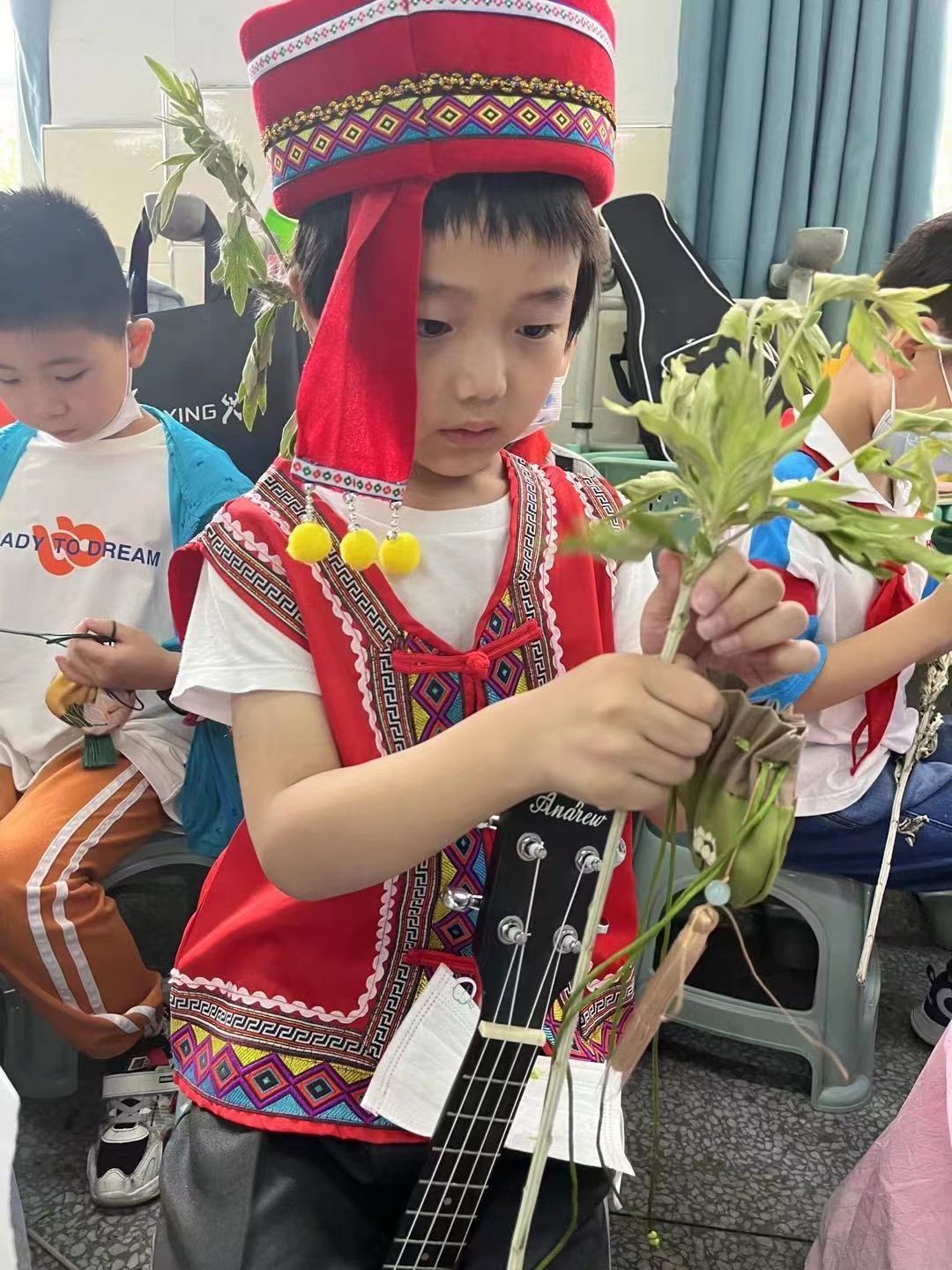 “门插艾,香满堂。包粽子,赛龙舟。额点砂,乐满堂。”在端午节之际,江夏区大桥保利军运村幼儿园将艾草插、菖蒲插到各班级门口,小朋友们身穿汉服走过由艾草铺就的小径,老师们在孩子额头上点朱砂、画“王”字,借朱砂以驱毒,借猛虎以镇邪,祝福孩子们平安康乐。