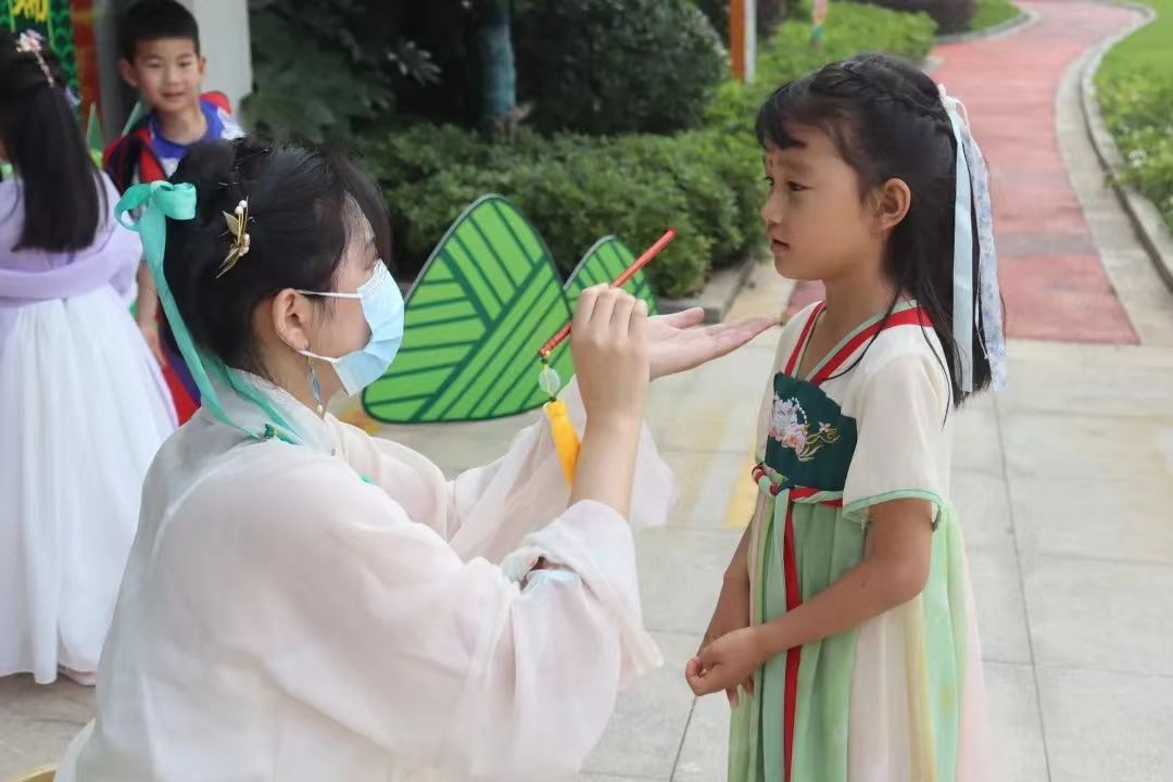 武汉市常青第一学校的孩子们也穿上汉服,画彩蛋、诵诗词,仿佛从古代“穿越”而来。该校学生说,传统服装也是中华文化的一部分,穿上汉服过端午,更有韵味。