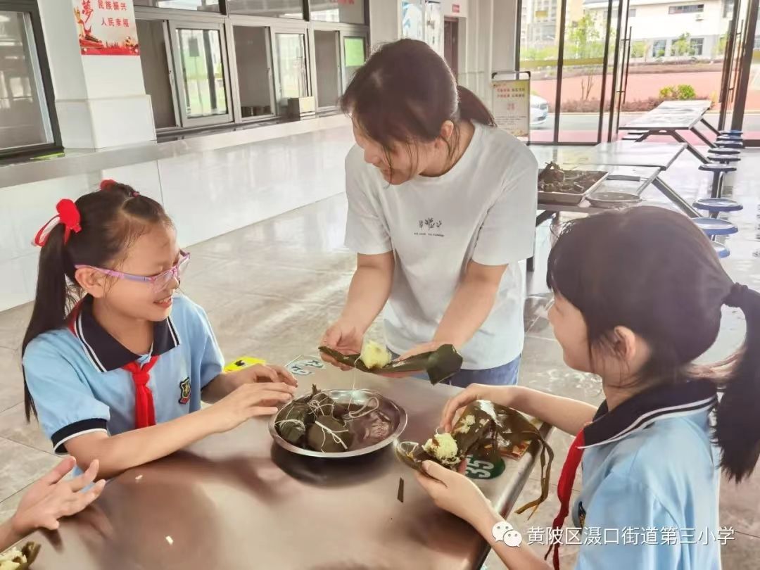 黄陂区滠口三小的同学们也跟着老师学包粽子,还在食堂将粽子下锅煮熟,现场品尝自己做的美味。孩子们说:“吃自己做的粽子最美味!”