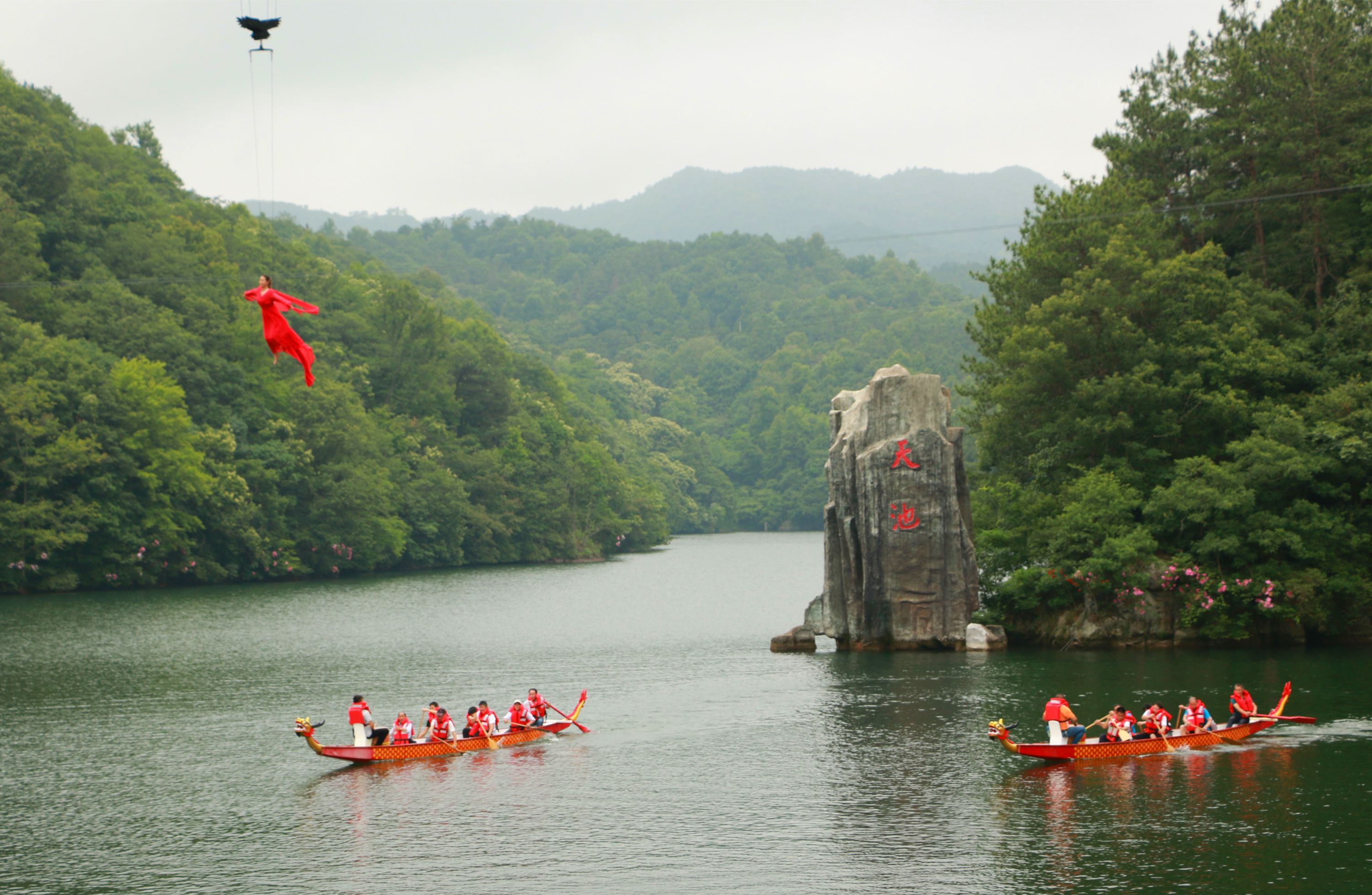 当天上午,来到木兰天池景区“大天池”,只听得湖面上鼓声隆隆,两支龙舟正在破浪冲刺,快速而整齐的船桨拍打出阵阵水花。龙舟之上,还有穿上威亚的“红衣飞仙”迎风飞跃,与正在竞速的龙舟相得益彰,带来一场别开生面的龙舟观赏赛。