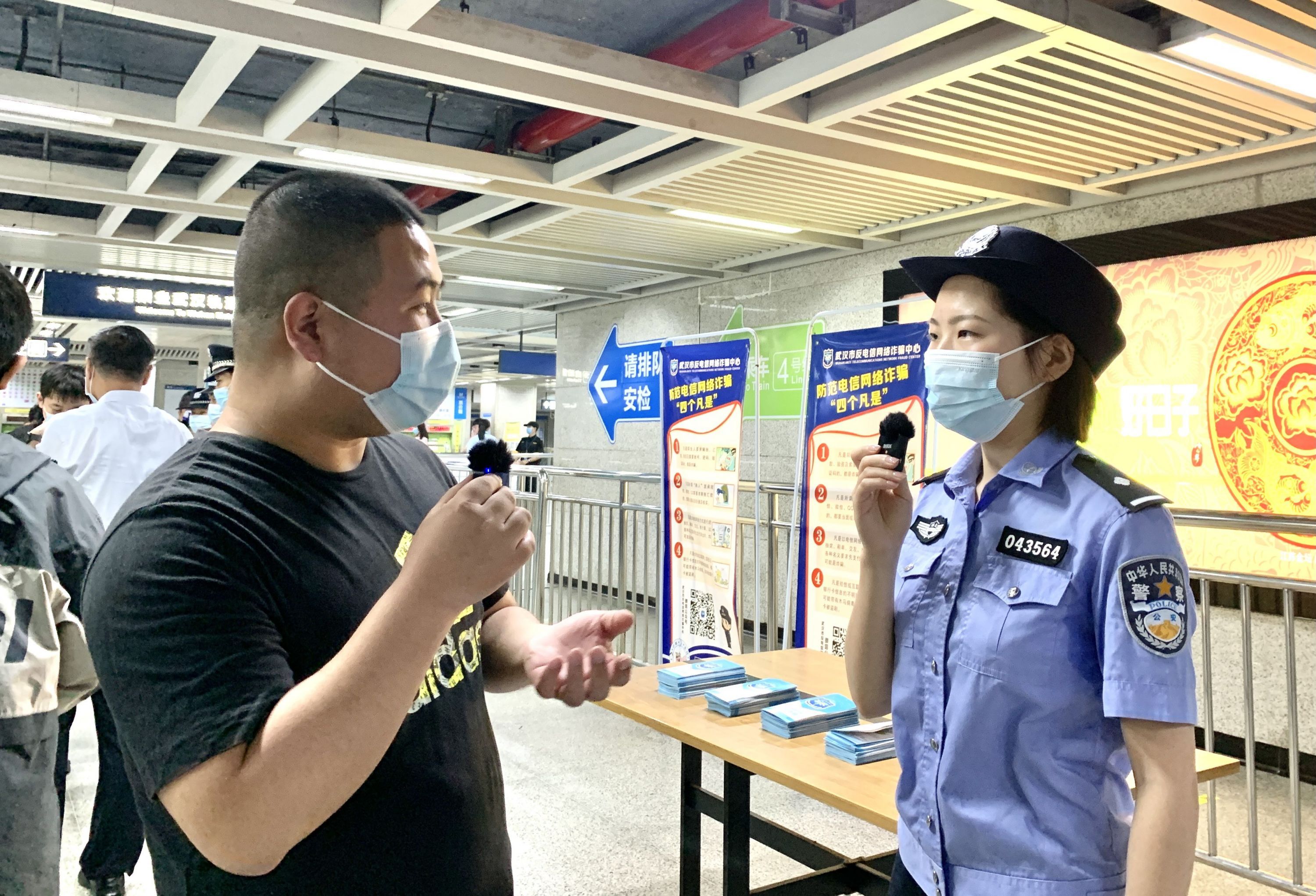 长江日报大武汉客户端6月3日讯 6月3日上午9时,端午节首日,武汉市公安局轨道交通管理分局在地铁4号线武昌火车站内开展了一场反诈宣传活动,并同步在长江日报大武汉客户端APP现场直播。