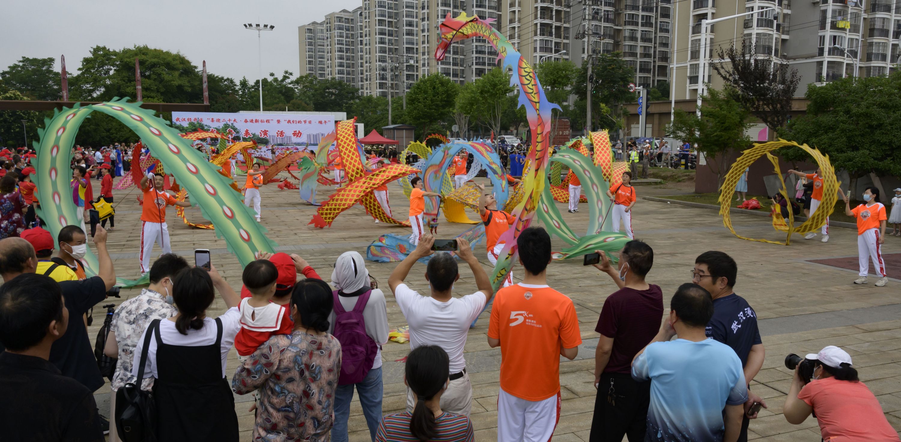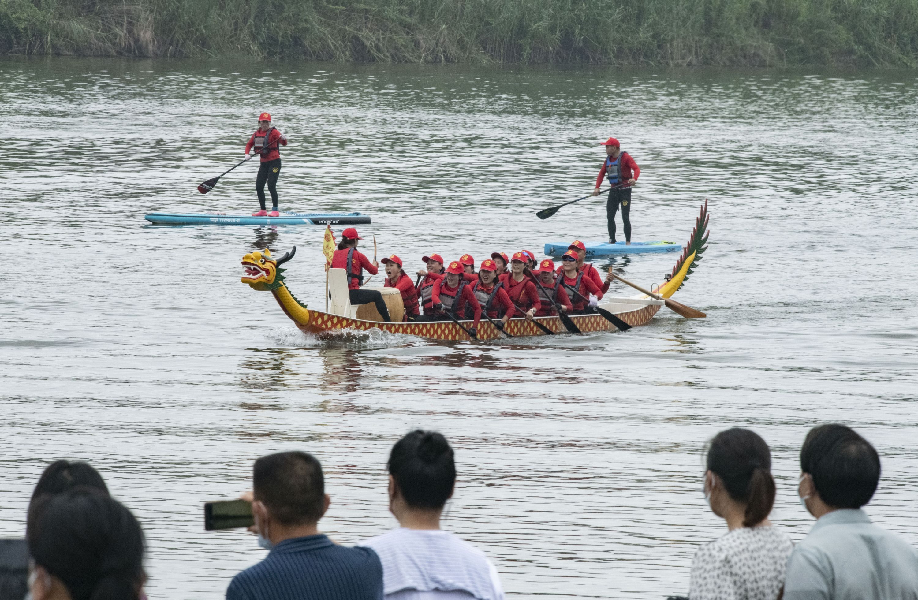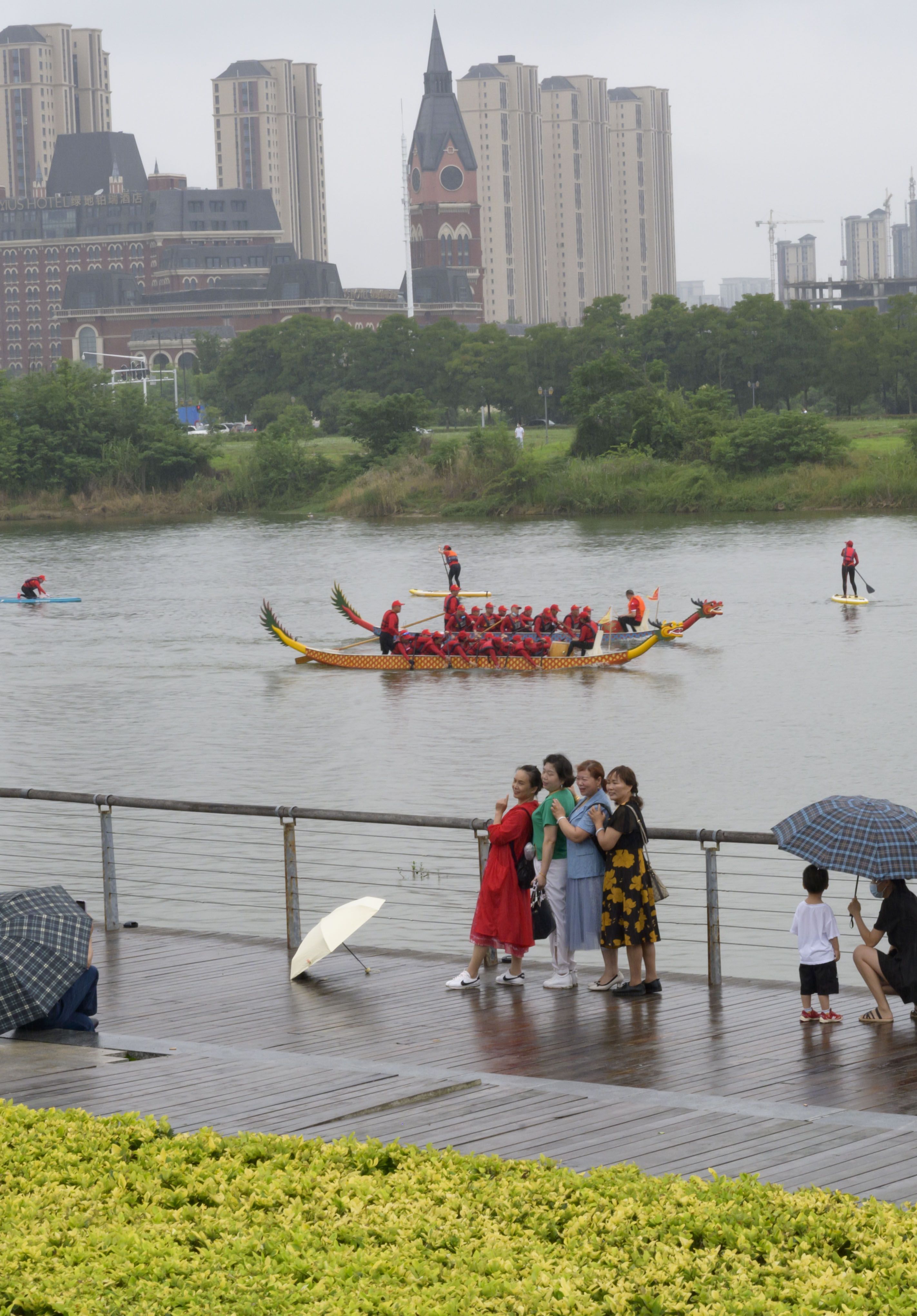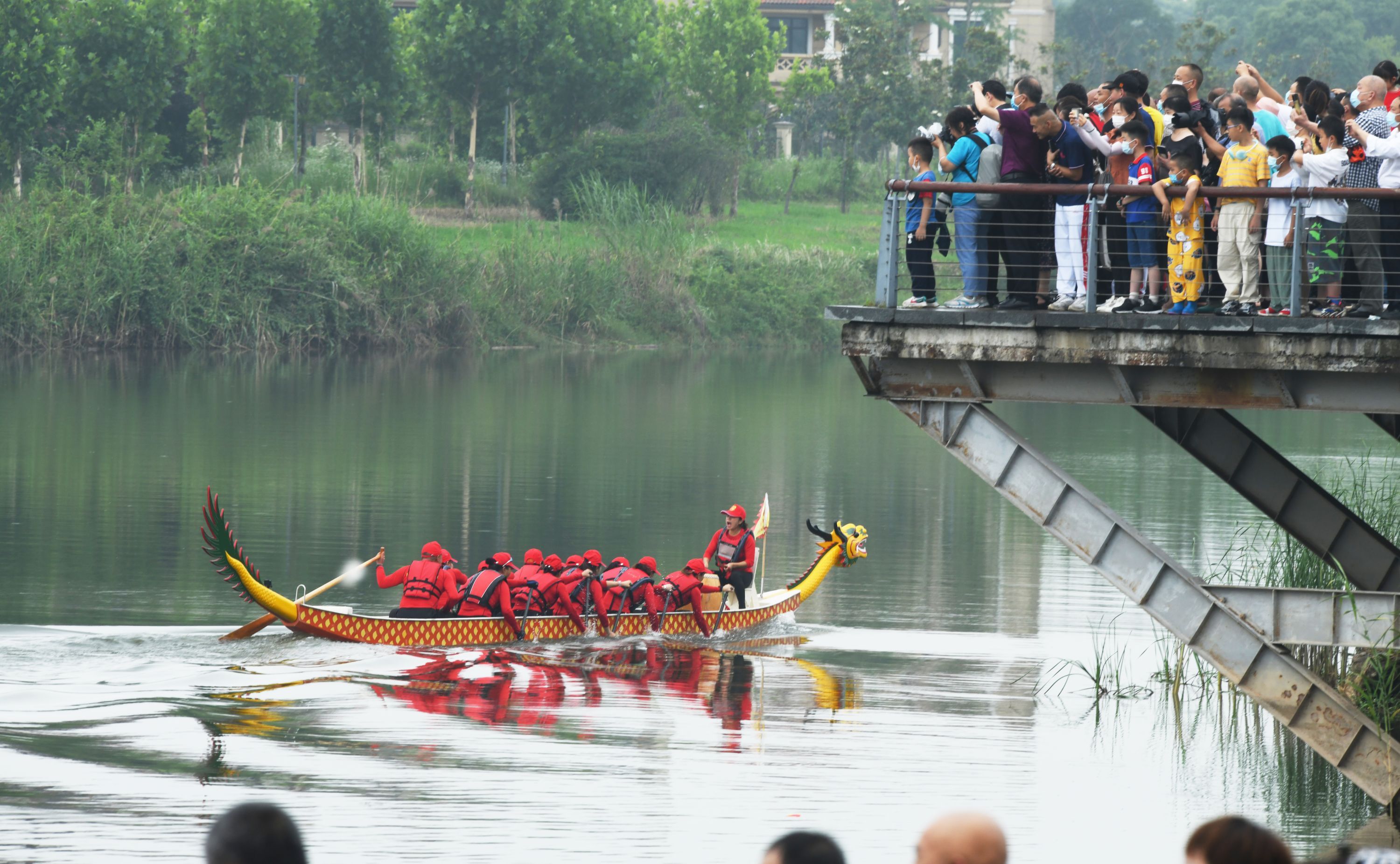 2022年6月3日上午,武汉经开区(汉南区)纱帽街马影河绿道上,“我们的节日·端午”龙舟表演活动拉开序幕,锣鼓声中两条龙舟在碧绿的河水上竞逐,两岸数千群众尽情观赏,端午节日氛围浓郁。