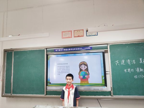“今天晨会课内容主要是介绍世界环境日的来历,我们为什么上这一课?因为中国是全球生态文明建设中的重要参与者、贡献者、引领者。”省优秀少先队辅导员、市教师学科带头人胡凯老师介绍,“我们前川五小是区级绿色学校,有责任有义务从孩子们的环境意识抓起,培养良好的生态环境保护习惯。现在是晨会课时间,学校58个班级2000余名学生正在学习环保知识。”
