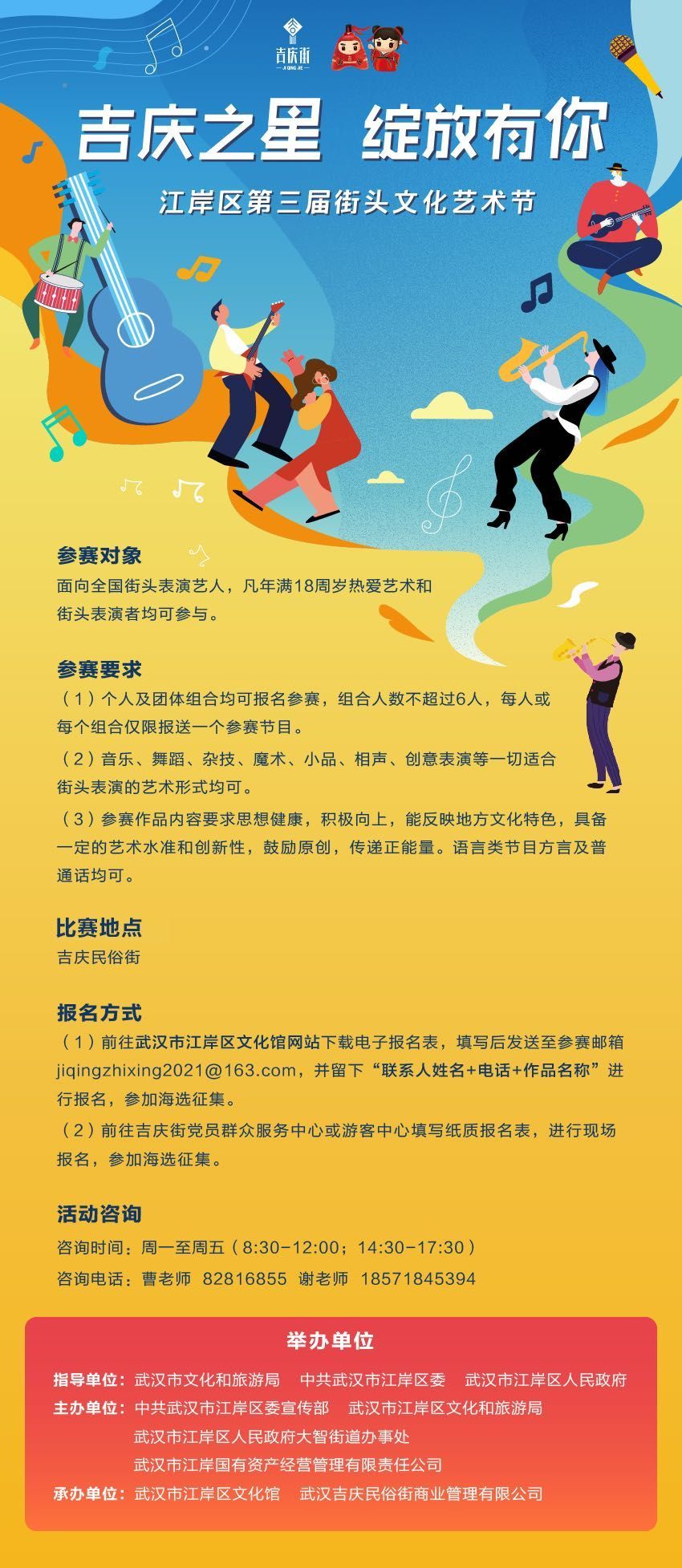 吉庆之星,绽放有你。江岸区第三届街头文化艺术节,丰厚大奖等你来呦~。(详情见海报)