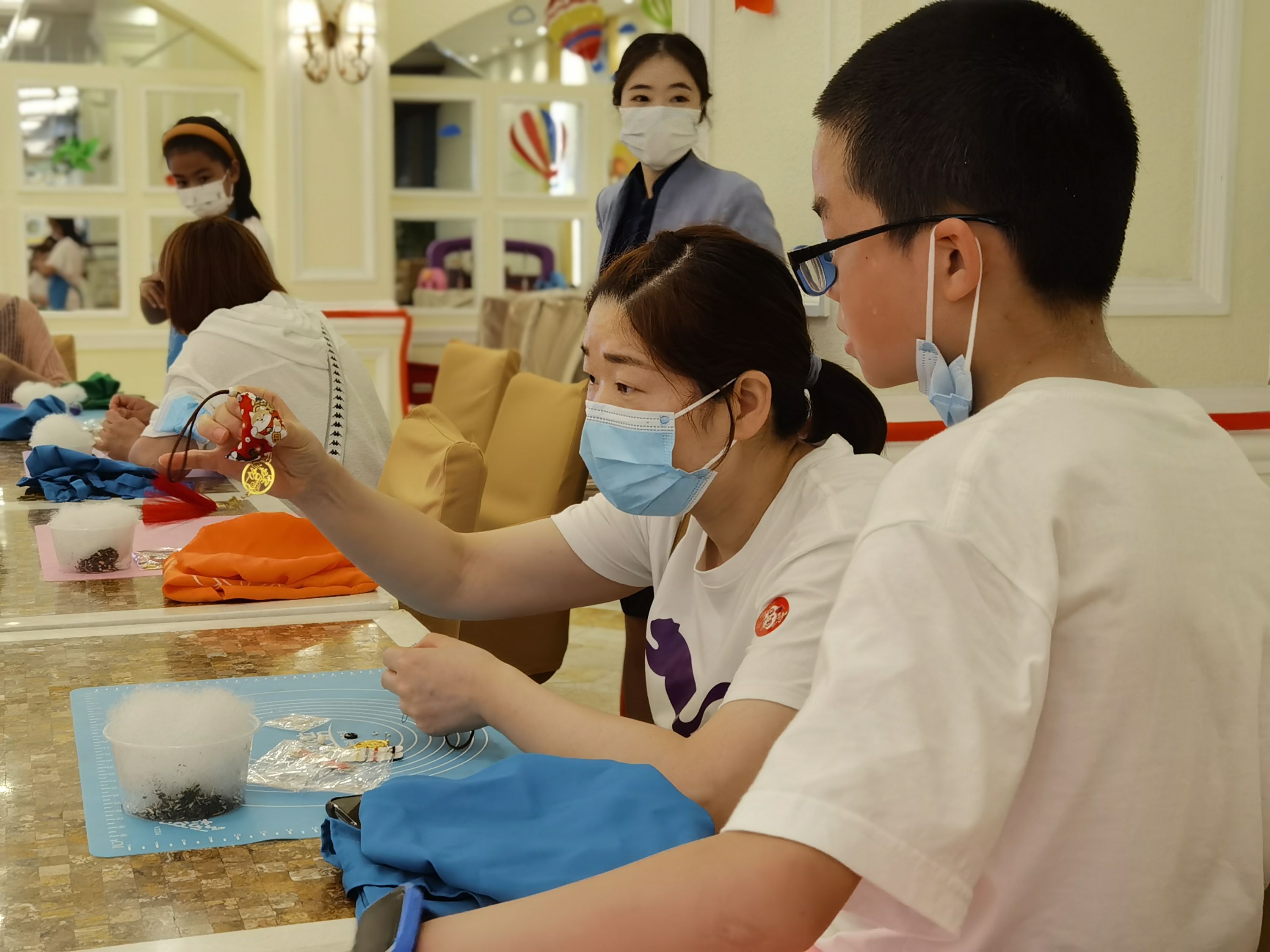在洪山宾馆,亲子家庭制作香囊、手工粽子,玩得不亦乐乎。记者黄丽娟 摄