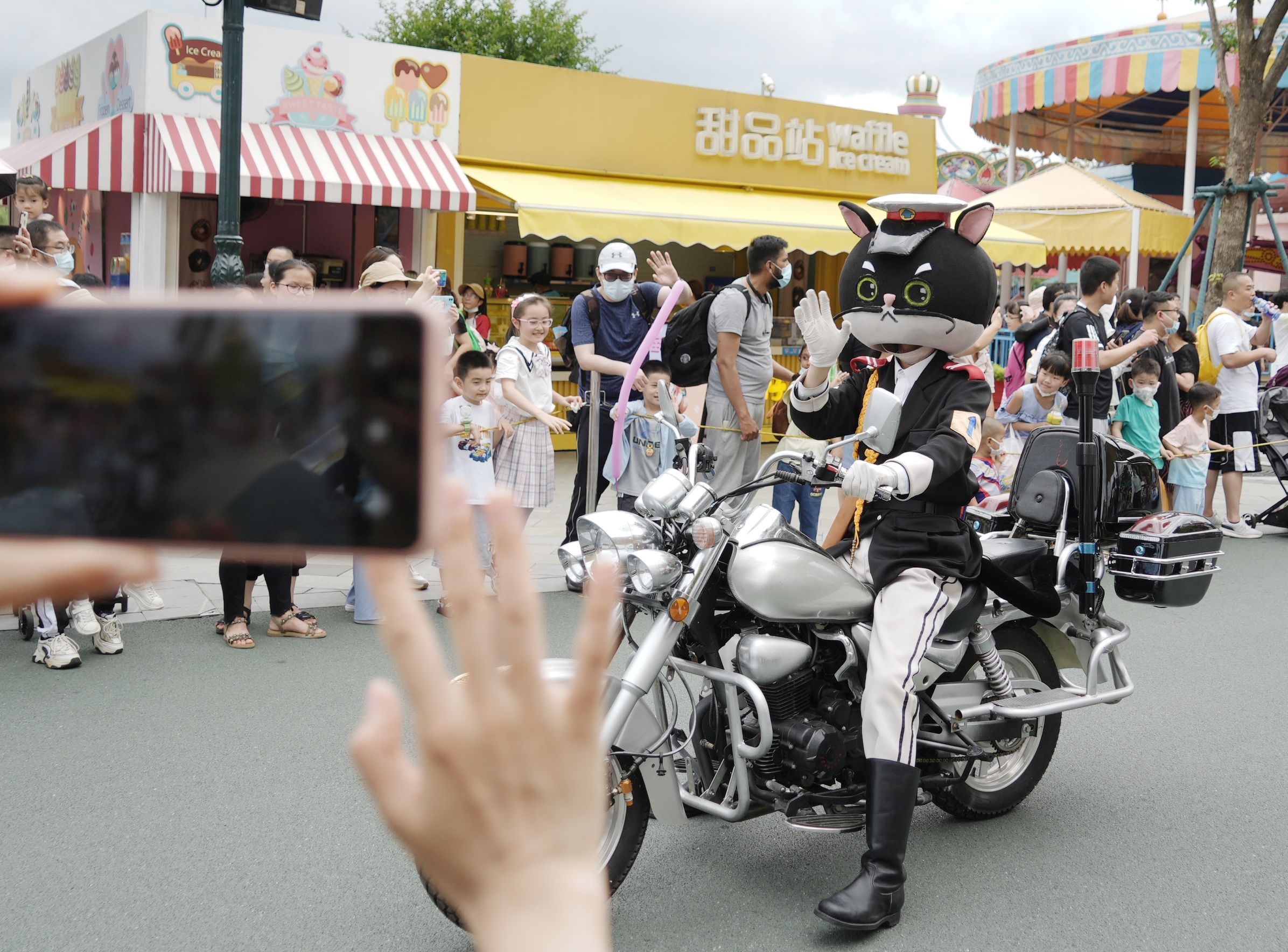 沙包游戏还未落幕,广场中心舞台区的互动舞台剧好戏连台。黑猫警长、葫芦娃、巴克队长等卡通明星一亮相就赢得了现场观众的热烈掌声。随着剧情的推进,台下观众们时而欢呼,时而大笑,仿佛走进童话世界。“欢乐谷里的童话剧勾起了很多童年回忆,趁着端午假期,在这既能在游戏里感受端午氛围,还能再过一次儿童节,一举两得。”在武汉就读大三的雷澳婷笑着说道。