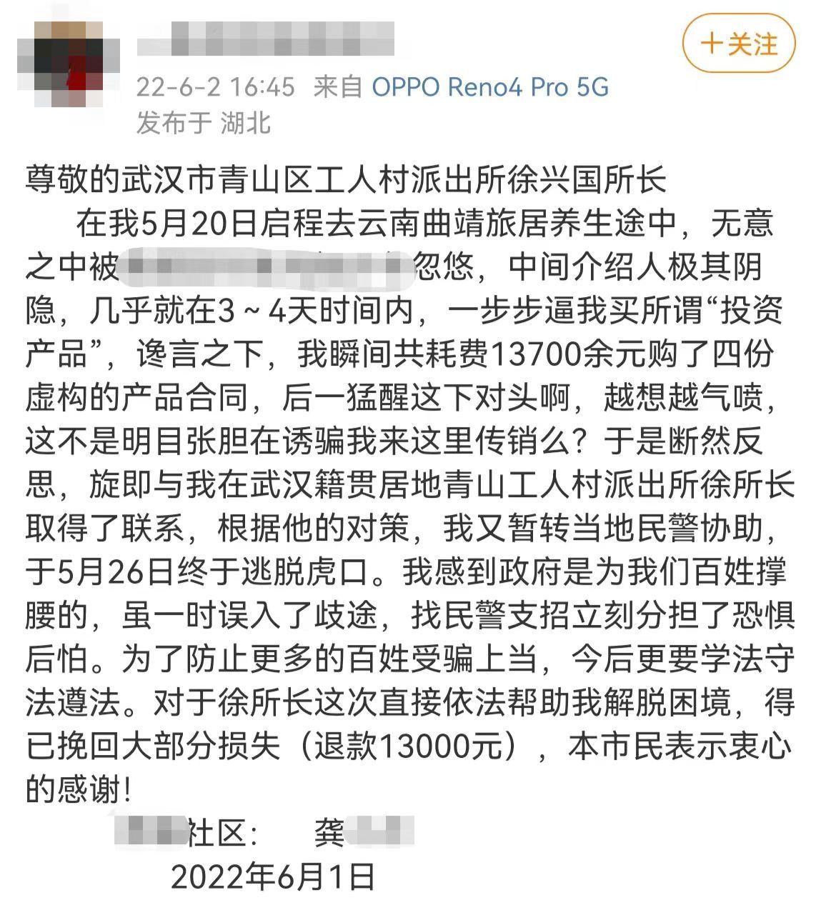 武汉一女子远赴云南见网恋男子,不料落入了传销陷阱,被洗脑后花1.3万元购买投资产品;危难之时通过微信向家乡民警求助,在民警的远程指导下成功逃出传销窝点,云南警方也及时为其追回了被骗的1.3万元钱。近日,该女子平安回到武汉后,特意在武汉城市留言板留言,为民警点赞。