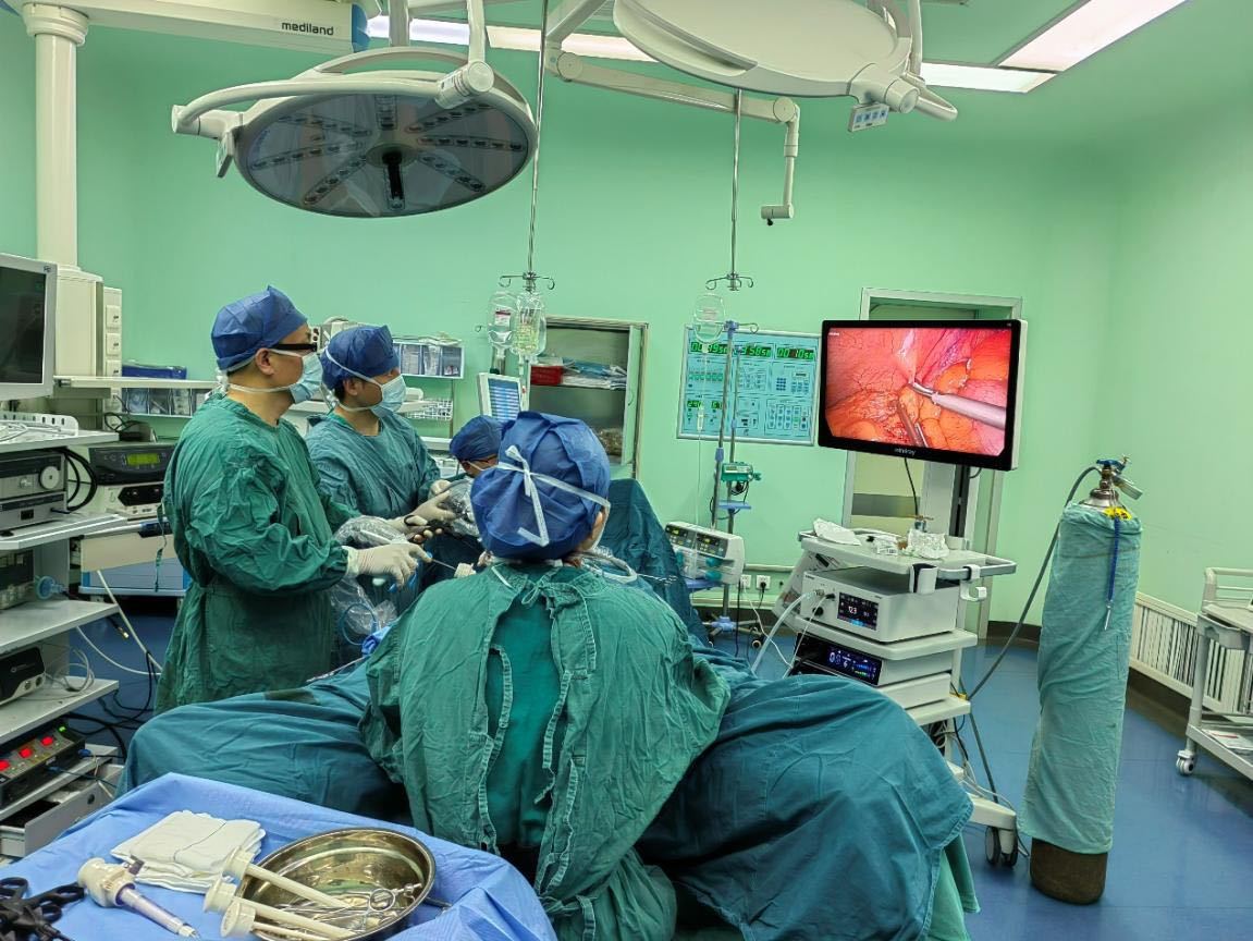 经术前充分准备,在麻醉科和手术室的配合下,由李明杰主任带领团队实施手术,整个手术过程经历3小时,包括组织游离、肿瘤切除、淋巴结清扫、消化道重建均在腹腔镜下完成,手术创口小,便于预后恢复,并在术中注射吲哚菁绿(ICG)荧光实时显示肠管及吻合口血流灌注情况,显示患者肠管吻合精准,手术顺利完成,通过微创手段,精准切除了肿瘤。
