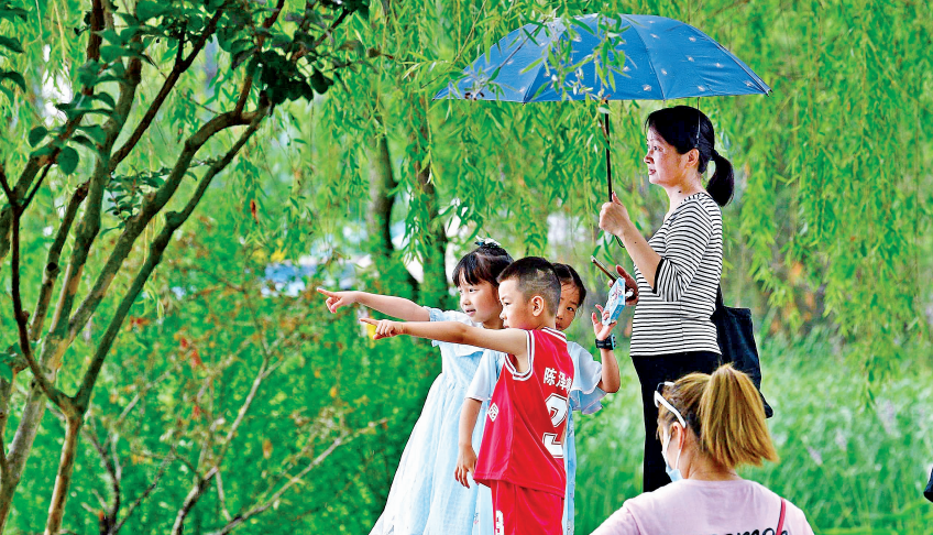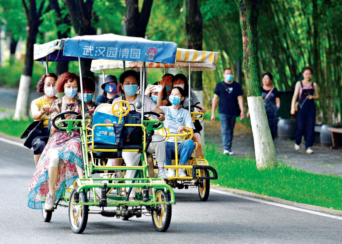 6月4日,武汉天气有点闷热,还不时落雨,就近游园成了市民的首选。武汉园博园内,不少市民带着孩子前来,骑着观光自行车穿行花间林荫道,在荷塘边喂鸭子看小金鱼,放松心情,畅快游玩。