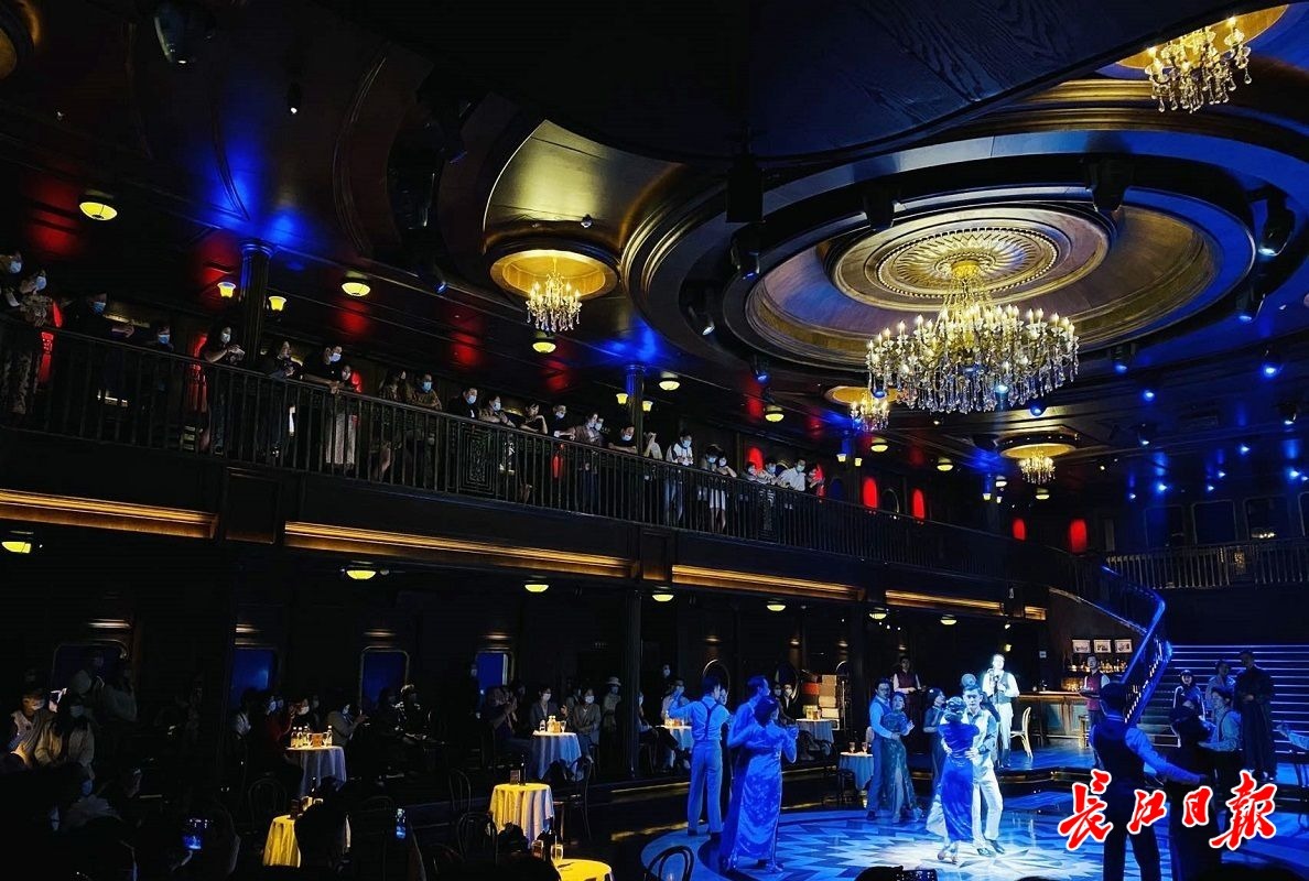 晚上7时许,在“知音号”码头检票处,游客配合工作人员进行检票,并查验健康码、行程码和72小时核酸阴性证明,依次隔开距离有序排队进入,在长江首部漂移式多维体验剧《知音号》中重遇老武汉繁华景象。端午假期,“知音号”每晚开放一场演出,带领游客穿越百年,听老武汉故事。演出中,演员突破传统舞台框定的区域,就在游客身边,提供了独特的沉浸式剧场体验。“我们能观看到演员的每一次动作、每一个眼神,表演细节一览无遗,表演很有感染力,看得很过瘾。”一位观众感叹道。