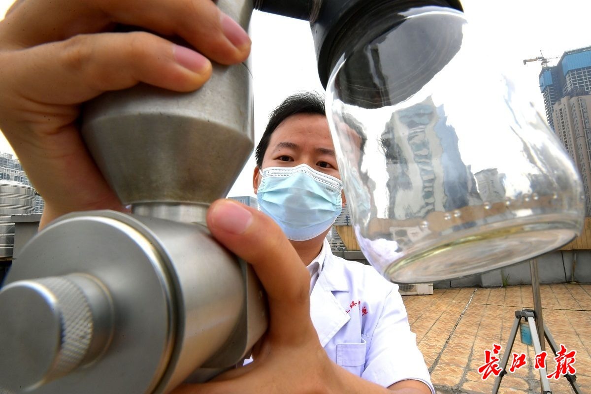 汉口长江日报路与香江路交会处,一栋陈旧低调的楼房楼顶,布设了数十种不同的监测设备。钟章雄在采样平台检查设备。