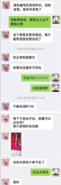 龚女士表示,祝某将自己盯得紧,当时祝某正在屋内午休。龚女士一边和徐兴国聊天,一边快速将聊天信息删除。徐兴国很快又发来了一个电话:0874110,要龚女士赶紧跑出去,并打这个电话报警。