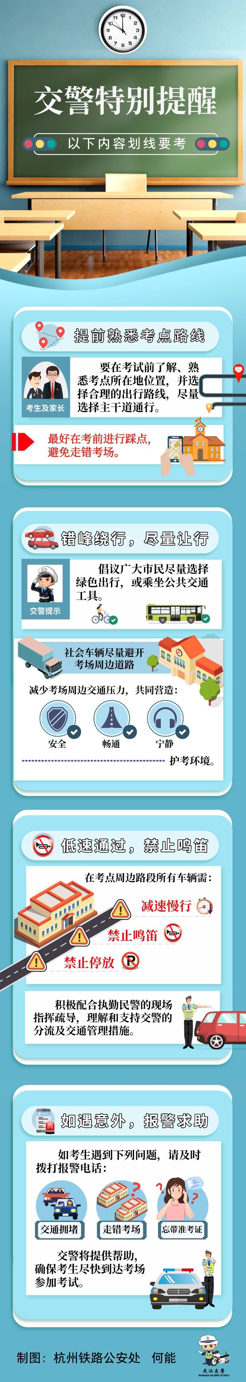 武汉交警提醒,因考生入场需核验信息,部分考点可能会因排队等原因出现短时人、车滞留,考生和家长应打好提前量。特别是6月9日上午、下午各有两门考试,会出现多次送考情况,考场周边接、送考生的车流易聚集、交织。