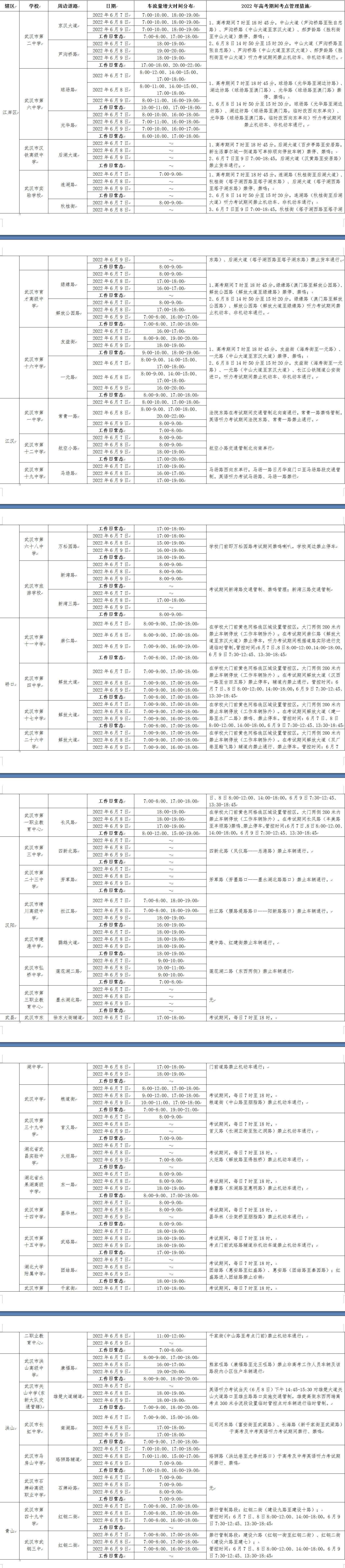 中心城区的部分考点考生人数过千,预计周边道路会出现拥堵状况:武汉二中周边的卢沟桥路和京汉大道、武汉六中周边的球场街和澳门路、武汉市实验学校周边的连湖路、武汉三中周边的四新北路、长虹中学周边的巡司河东路和南湖路、马房山中学门前的珞狮路辅路,以及石牌岭高级职业中学周边的石牌岭路等,因早晚高峰通勤车流叠加,预计拥堵延时指数仍趋于高位。
