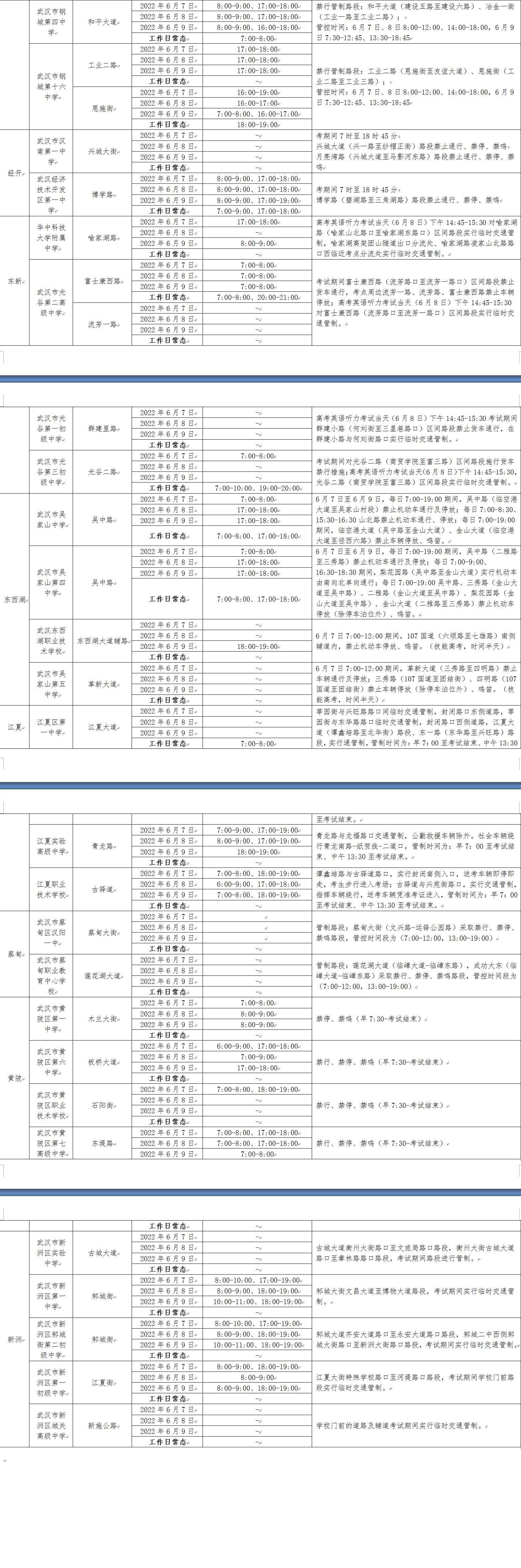 新城区的黄陂一中附近的木兰大街、新洲区实验中学周边的古城大道和衡州大街、新洲一中周边的邾城街和文昌大道因考点考生人数超过1500人,预计周边道路因送考车流增多而拥堵。