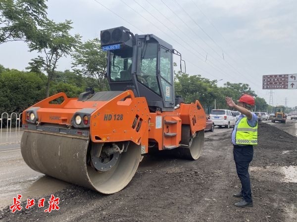 柳军指挥压路机铺压沥青,保障其余车辆正常通行。 记者徐丹 摄