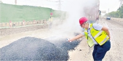 柳军为刚刚倾倒出来的沥青测温。记者徐丹 摄